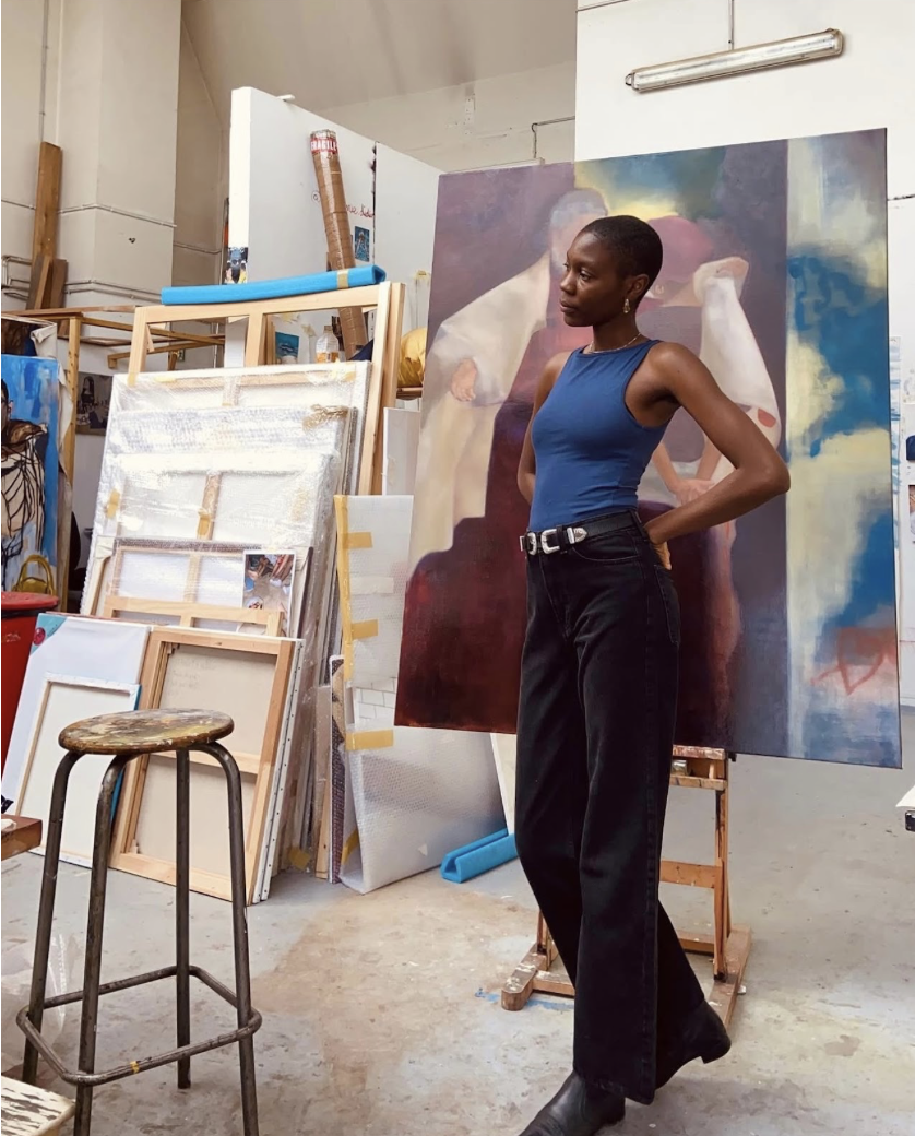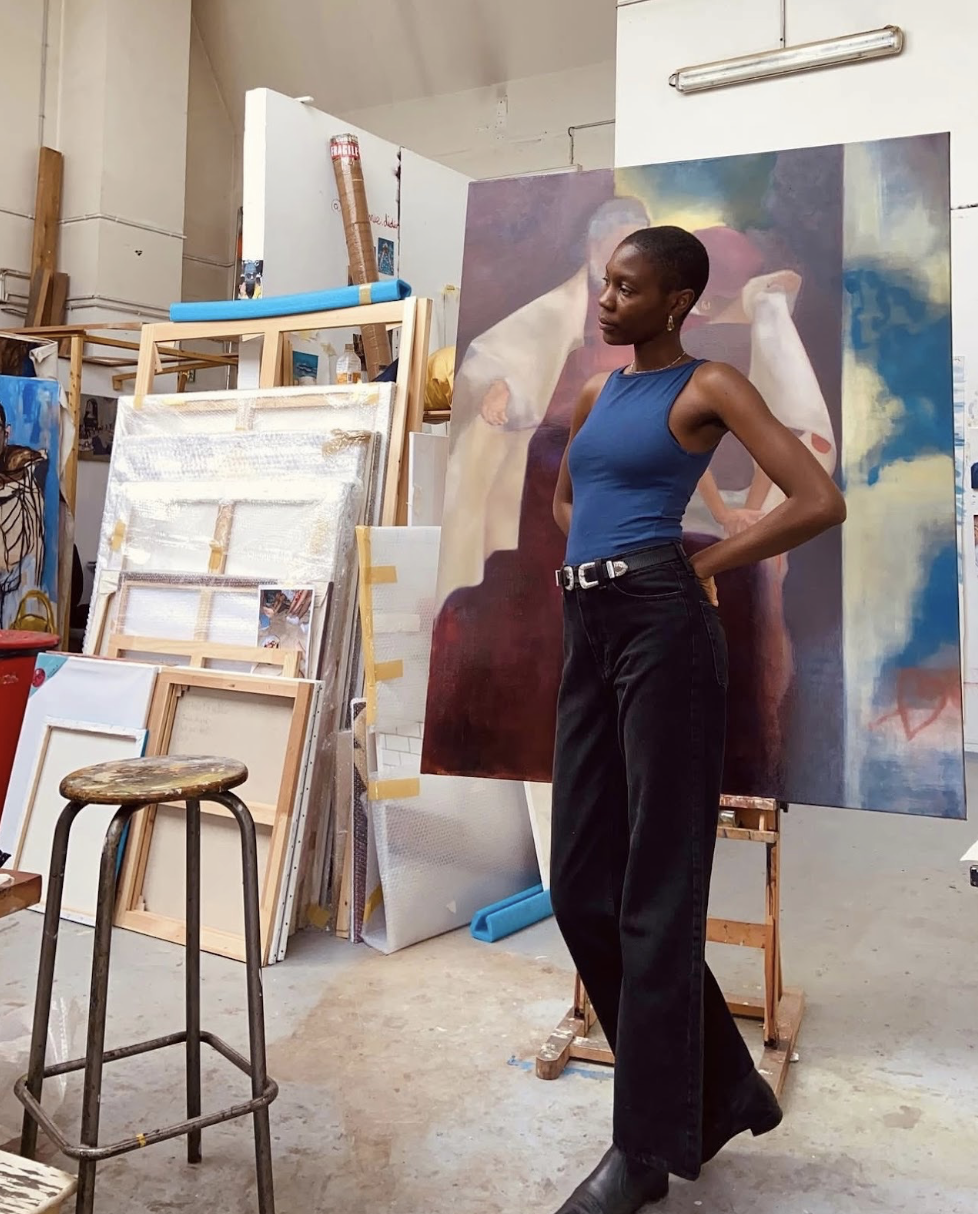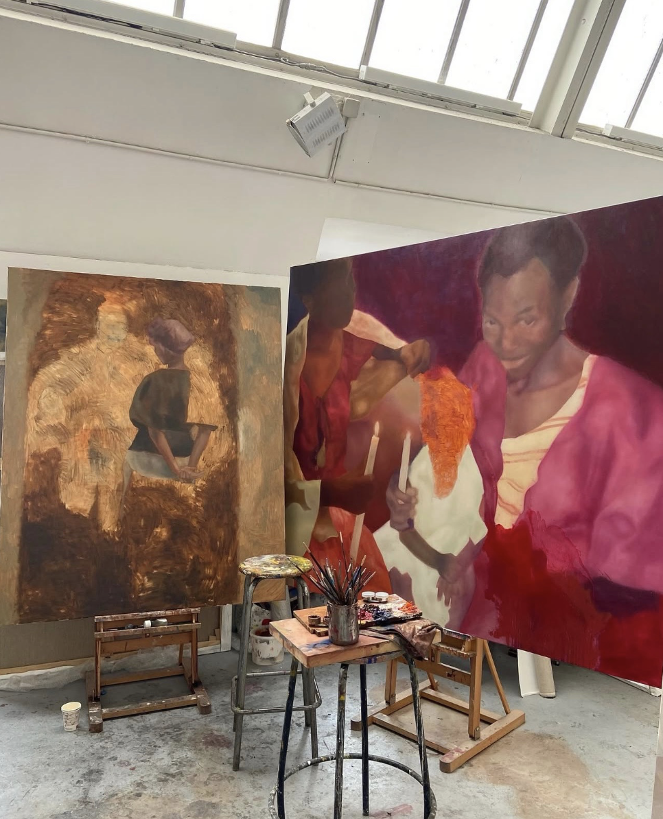 Figure 2.1: Maria Adjovi, On Hope’s Threshold [in progress], 2025, oil on canvas, 78.74 × 66.92 inches (200 × 170 cm). Photo: courtesy the artist © Maria Adjovi