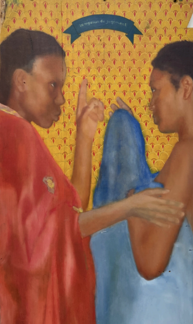 Figure 13: Maria Adjovi, La négation du jugement [détail], 2023, huile sur bois, 48,03 × 15,35 pouces (122 × 39 cm). Photo: avec l'aimable autorisation de l'artiste © Maria Adjovi