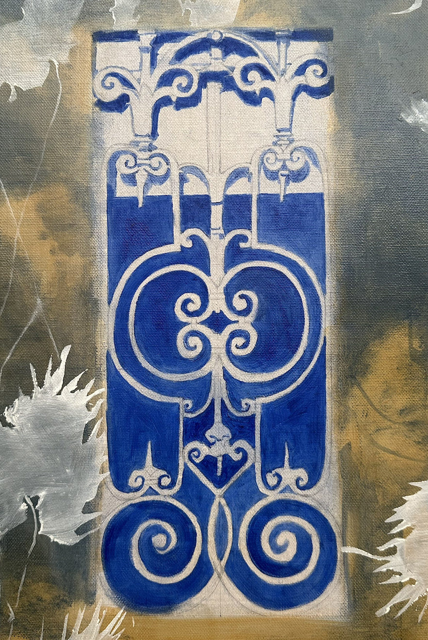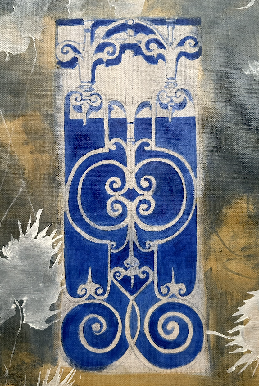 MA: Avant d'entamer une toile, j'ai déjà souvent une vision claire de ce que je souhaite transmettre et représenter. J'attends le moment où tout se met en place pour commencer à peindre. Ici, j'ai d'abord peint l'élément de la porte, puis j'ai progressivement intégré divers détails tirés de mes observations. J'ai construit cette composition à l'aide de taches de peinture et d'autres textures, afin de fondre les couleurs harmonieusement.