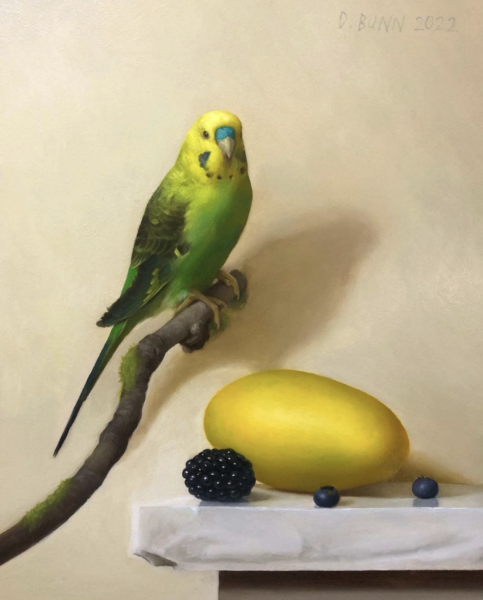 Figure 8: Dan Bunn, Parakeet with fruit, 2022, oil on board, 10 × 8 inches (25.4 × 20.32 cm). Photo: courtesy the artist © Dan Bunn
