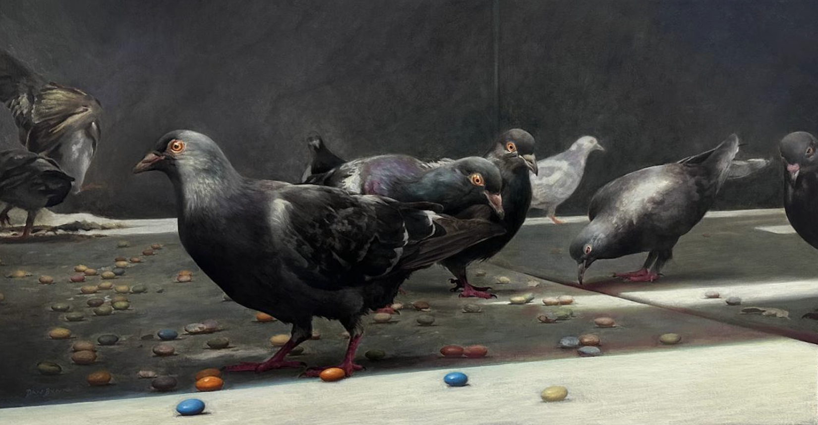 DB: I really like that we have access to people and foods from all different cultures in New York City, so I try to include novel fruits or other items that speak to that. Those are some really tasty sesame danishes from Old Poland Bakery in Greenpoint. I’m now playing with integrating New York settings in the paintings, rather than just the item placed in this fantasy fabrication. We’ll see…but no promises…I just painted some pigeons pecking at some M&Ms on the sidewalk…[laughs].