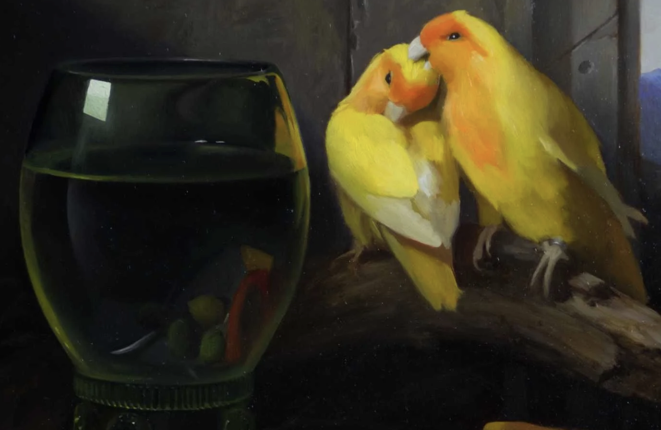 LX: Yes, art school is pricey, so I get what you mean. It’s good to have that flexibility. Let's talk about your Fruit on a Ledge series. I really admire your attention to detail to creatures, and that you paint everything from salamanders to birds. This Lovebirds one is stunning.