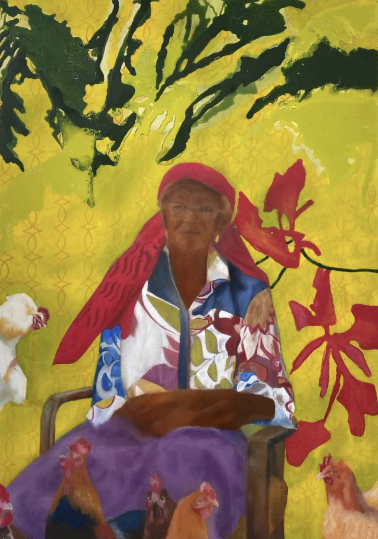 MA: Ah, oui. Un homme m'a contactée après avoir découvert mon travail sur Instagram et m'a demandé de dessiner sa grand-mère. Il m'a raconté son histoire de vie, celle d'une éleveuse de poules. J'ai été très touchée ; j'ai donc décidé de réaliser une peinture à ce sujet. J'ai passé des heures à l'observer, à apprendre à la connaître. Certaines de mes œuvres font directement écho à mon histoire familiale et à ma culture. Les histoires de famille, comme celle de cette femme qui travaillait seule au marché pour subvenir aux besoins de ses enfants, revêtent une grande importance à mes yeux. Ce sont des histoires de courage discret ; elles nourrissent mon imaginaire sans pour autant se muer en simples illustrations littéraires.