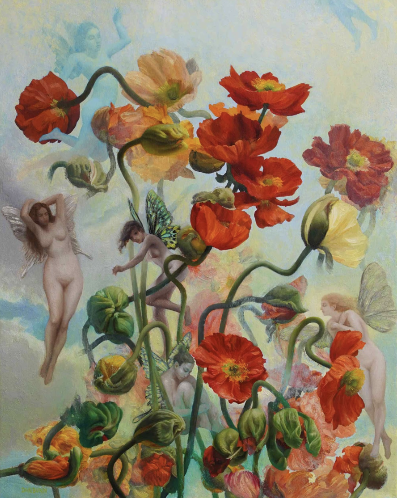 DB: I'm still working that out. I often connect different paintings with a particular song or album, so for Aether, I was listening to Bjork's song “Earth Intruders” on repeat. I wanted the fairies to have an ambiguous energy, where they might be a bit mischievous or trickster-y, and I think Bjork embodies that unpredictability.
