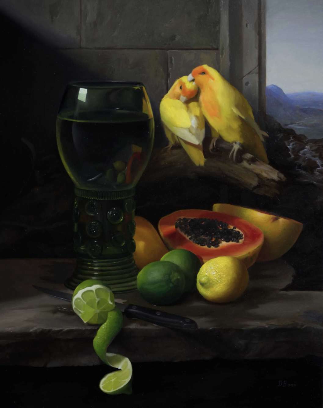 DB: It varies so much, but I have gotten a few funny or quirky reactions from curators. I am still finding how to jive with it. In 2019, I felt super lucky because my painting Orange Peeler was accepted to the Figurativas show at the European Museum of Modern Art (MEAM). I did a few group shows with Arcadia Contemporary, and recently with Nanny Goat Gallery in the Bay Area. A few years ago, a gallerist told me that I had to have at least ten solo shows of still lives before experimenting with other stuff, while rejecting a few of my non-still life paintings. Another saw a portrait sketch and said, “I need to give you some advice. You need to have more fun in your paintings. You’re being the Old Master, you should have more fun.” I think she was trying to say, “ Be more contemporary,” since a lot of what I’m making is inspired by the 17th century.