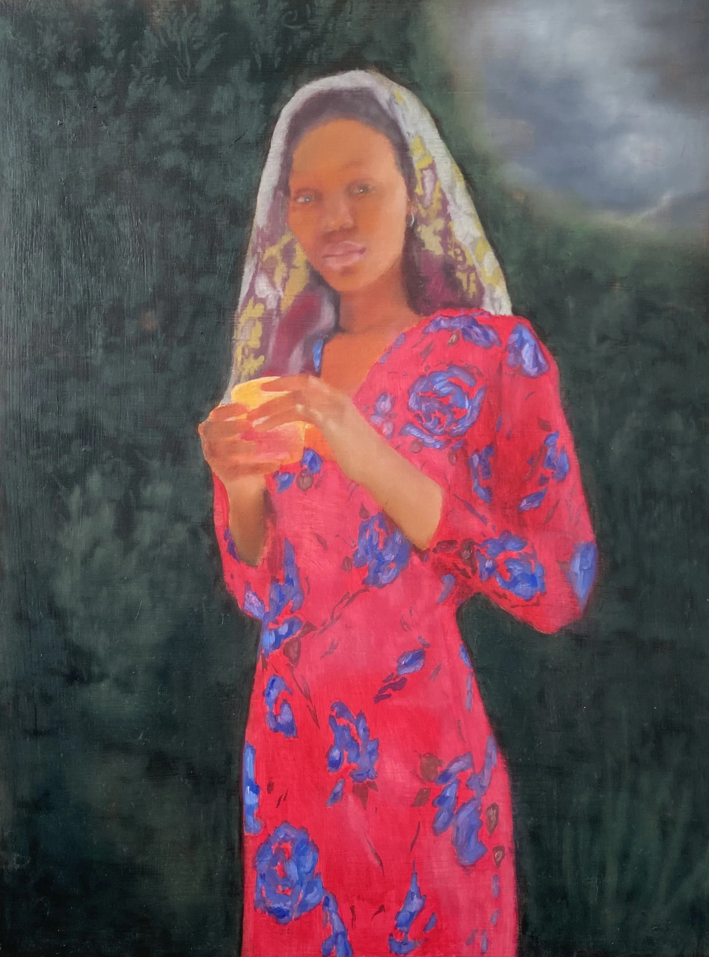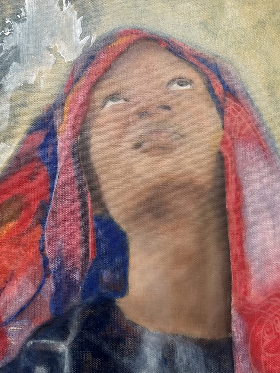 MA: Yes, with the hand behind. When I paint, every choice I make is deliberate. You can see that here [gestures to other work]. For this one, my sister posed for me, and I wanted to work on the theme of prayer and faith because I grew up in a very religious environment. It's a subject that's part of my story, and one that I'm now trying to explore through painting.