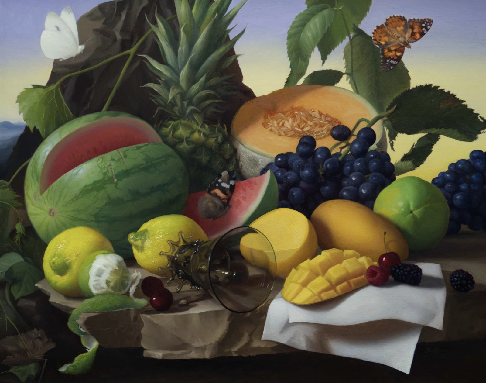 DB: Yeah, building the world is a super fun part of the process for me. I would like to expand some of the set ups into stand alone sculptures. I finished school right as the 2020 pandemic shut down the world and the only place we were allowed to go was the grocery store. I painted a handful of fruit pieces then, so maybe they were partially designed by circumstances as much as artistic choices, though I was definitely also inspired by fruit pieces of the past. I enjoy the subgenres and formal constructs of Baroque painting, like placing items on a ledge.