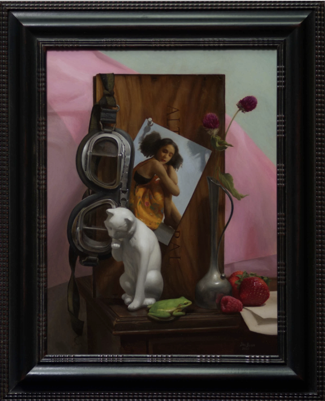 DB: Oh my. Paprika is this anime by Satoshi Khan, and it's one of the coolest films I've seen, and I wanted to make something about it. I think I did it in such a subtle way that nobody even noticed. The film helped inspire Inception, and it's about this person who makes a device that hacks into other people’s dreams. There's a dark whimsical frog parade thing with all these critters and other characters dancing through the sky. That was partly why I put the frog, and the main character is a girl named Paprika. The photo of the girl references her. I would like to make the overall concept easier for people to understand… for instance, if I made 10 still lifes inspired by 10 films. Maybe finding some level of maturity as an artist is to think of things in terms of bodies of work…almost like an album…though I do find that allowing for exploratory pieces fuels overall growth.