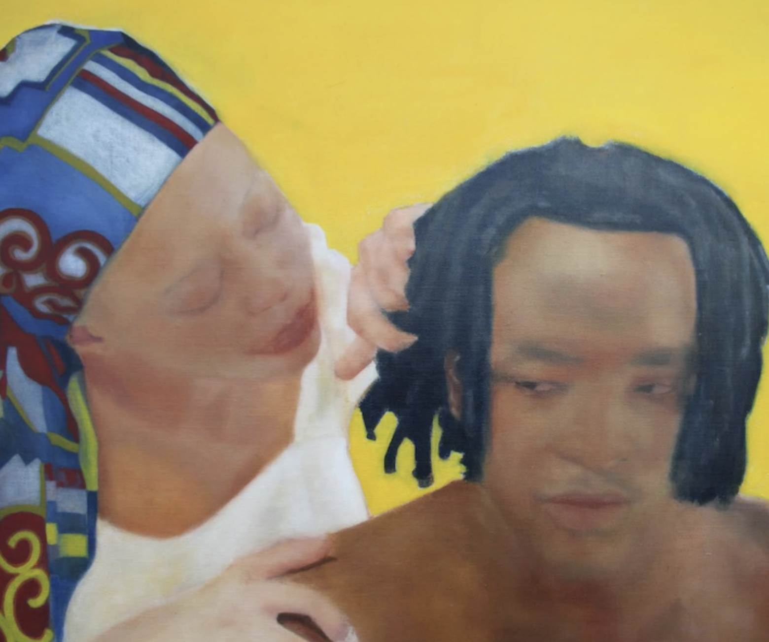 LX: C’est une interprétation intéressante. J’aime la façon dont la composition est structurée par ces plans dorés, empreints d’idolâtrie, ainsi que l’accent que tu mets sur les couleurs saturées et les vêtements. Qu'espères-tu faire une fois tes études terminées ? As-tu une exposition idéale en tête ?