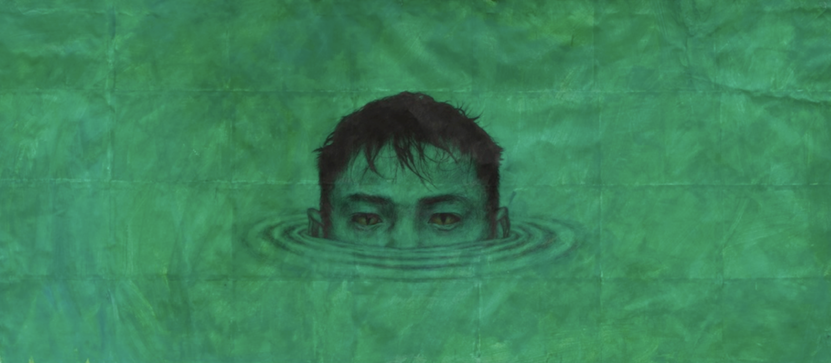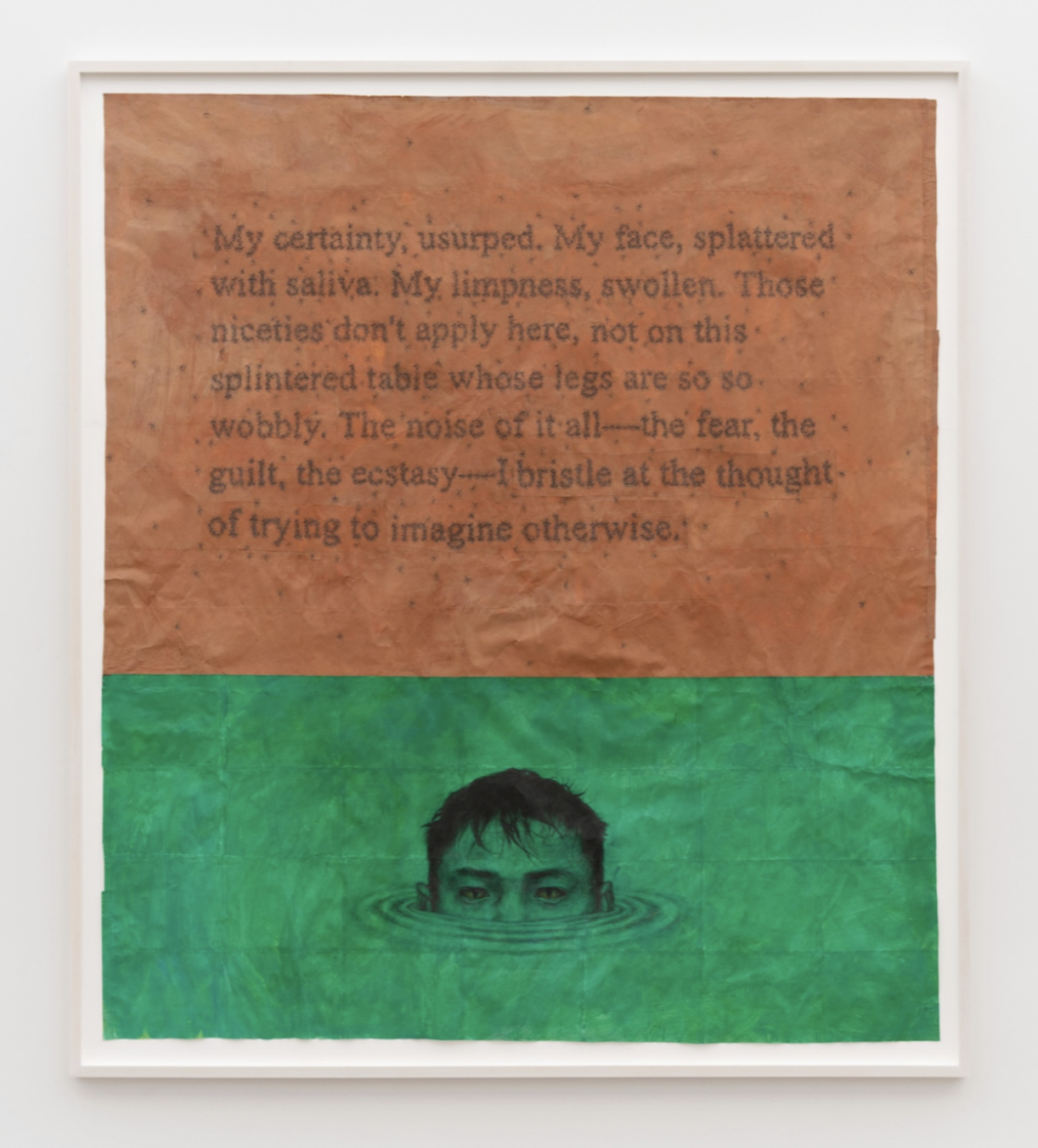 ZTN: Yeah! The words are made up of about 2,500 individually-drawn mosquitoes. I think I'm really interested in the meaning of the words, of the language, but within the context of the mosquitoes. Like, yes, it is about the homoerotic and masochistic implications of the words themselves, but, it's contained by the brevity of a moment when everything suddenly aligns and becomes clear, only for it to scatter away from you. Like, how precarious and fragile and fleeting a split second of clarity can be, and the desire that you have to hold onto it, or to stretch it out. That's what this drawing is. I see that in the lower green portion, too, with the head rising from the water, but I think a lot of its significance does lie in the upper brown portion, in the mosquito-text. I wrote about it in an Instagram post, which articulates it a bit better than how I'm explaining it right now, I think. I can read it for you: