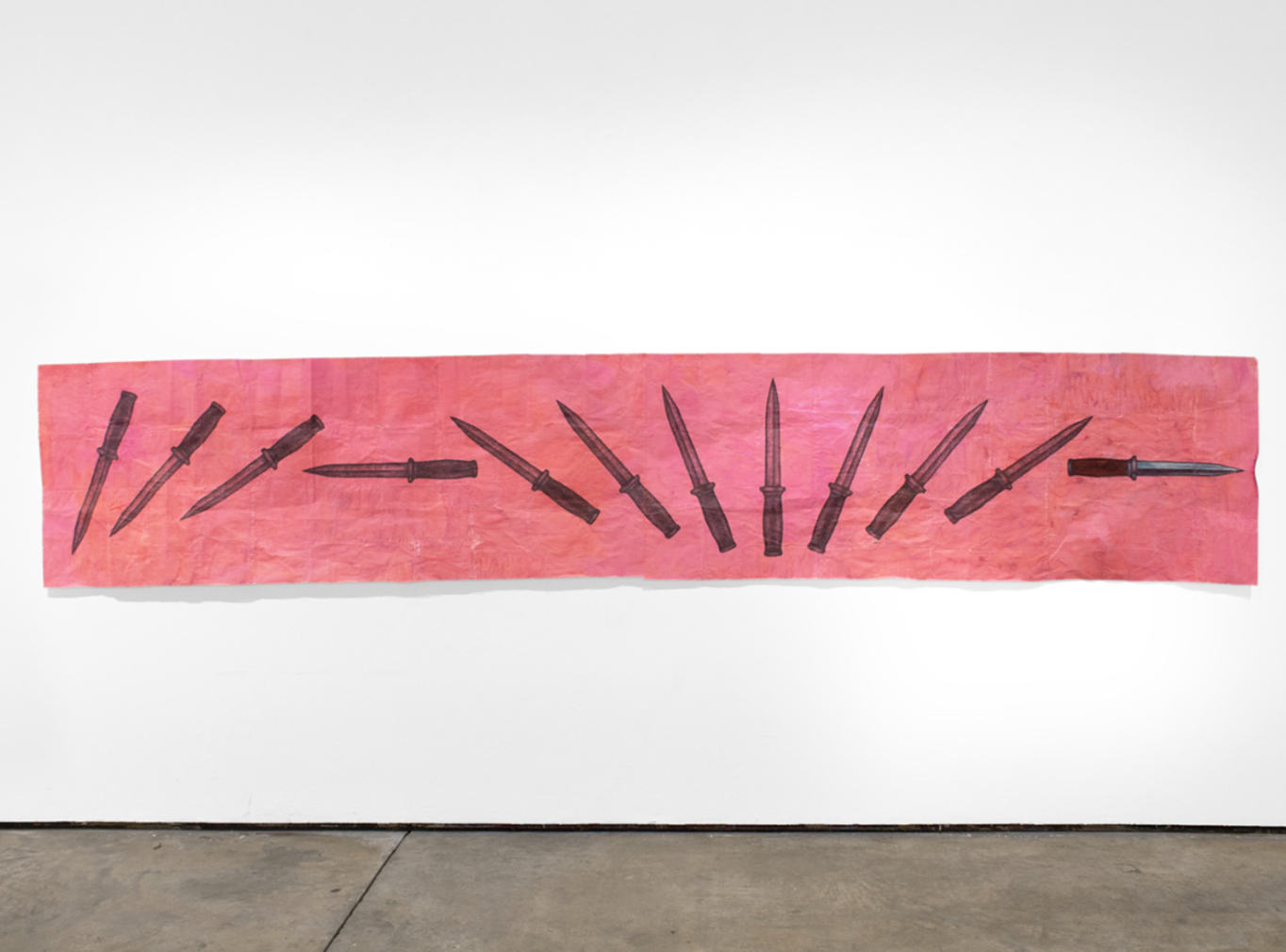 ZTN: Funny that we're following the smallest work in the show with this piece, which I think might be the largest. I had to watch a lot of slow-motion videos of knife throwers to make this drawing; I was studying how knives spin through the air, so that the drawing could imply that same movement. The process of drawing the same knife over and over again as it spins through space was really tedious and time-consuming, but I consider that to be part of the potential energy of the drawing and the effect it has on a viewer. The whole thing is about fourteen-and-a-half feet long—the longest single dimension out of all the works in the show—but it all comes down to the moment where the rightmost edge puckers inwards to meet the tip of the rightmost knife: the only one in the drawing that's fully rendered in color with soft pastel. That edge shifts into a deeper magenta or red, almost like it's bruising as it strains itself to meet the blade, like it's asking to be punctured. It’s about that split second before it hits—that tiny space between the tip of the knife and the edge of the paper.