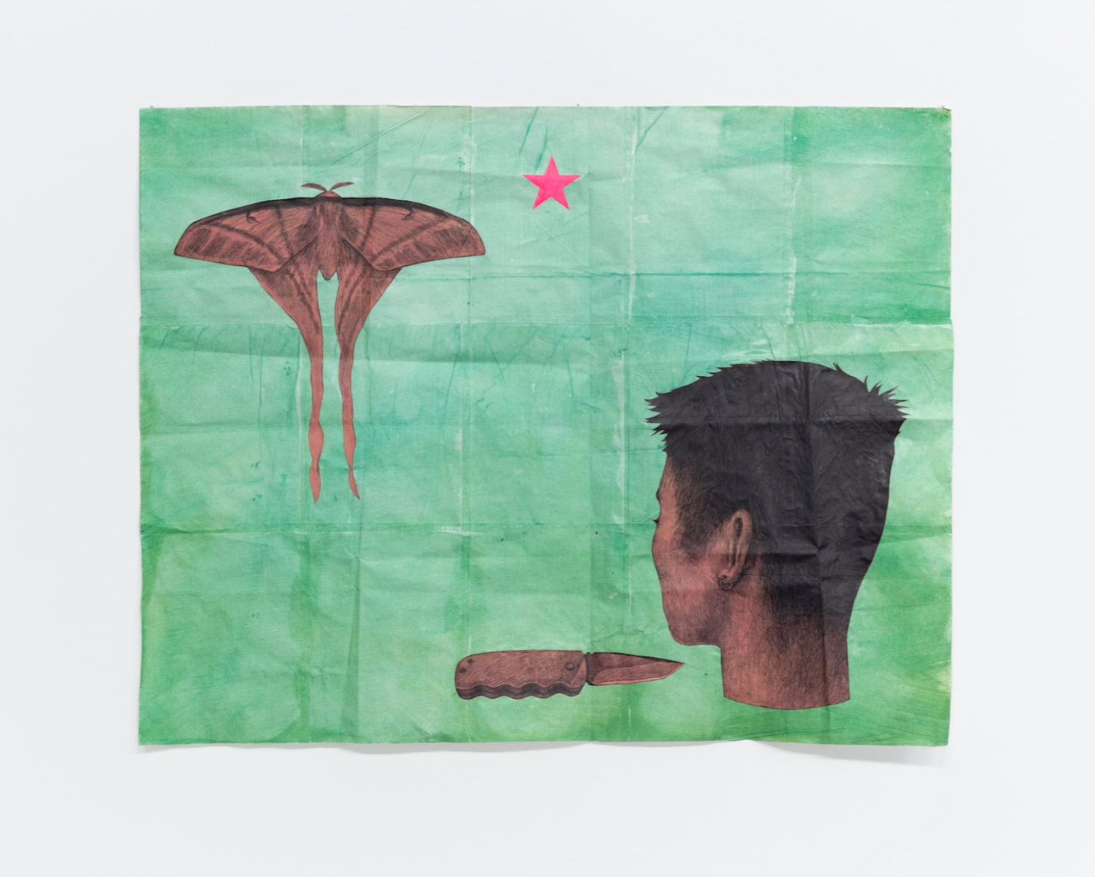 ZTN: So this piece is probably the start of the transition from my earlier work at Yale—which makes up most of what we've already talked about so far—to where my ideas are at now. It consists of a few motifs we've already discussed: folded paper, a five-pointed star, and an Asian American moon moth—specifically, a Pink Spirit Moth, which is indigenous to Laos and Vietnam. What's newer here is the pocket knife, which is based on the one my father carries, the severed head, and heavily saturated color. The head might be related to the cropped bodies we talked about towards the beginning, but I think it's really its own thing. When I draw heads without bodies, they aren't necessarily dead or decapitated, since I imagine them still capable of seeing, hearing, thinking, and speaking, but incapable of moving. That tension, that powerlessness or helplessness, definitely has political origins for me.